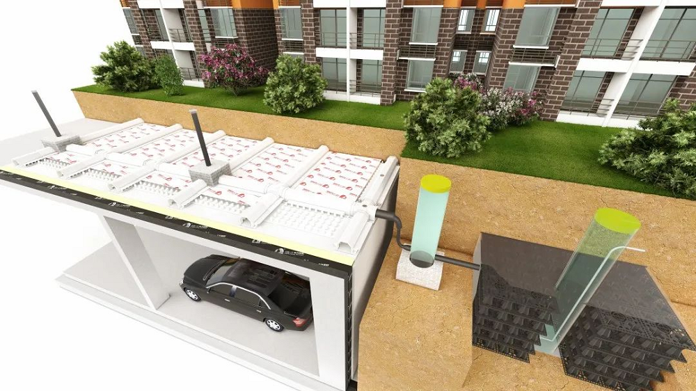 桃花源系統(tǒng)具有防水阻根、零度找坡、海綿理念等三大特點(diǎn)。不僅為建筑結(jié)構(gòu)提供持久可靠的柔性保護(hù),還能通過(guò)蓄水模塊將雨水收集再利用,滿足節(jié)水和水資源利用要求,符合綠色建筑和海綿城市建設(shè)要求。